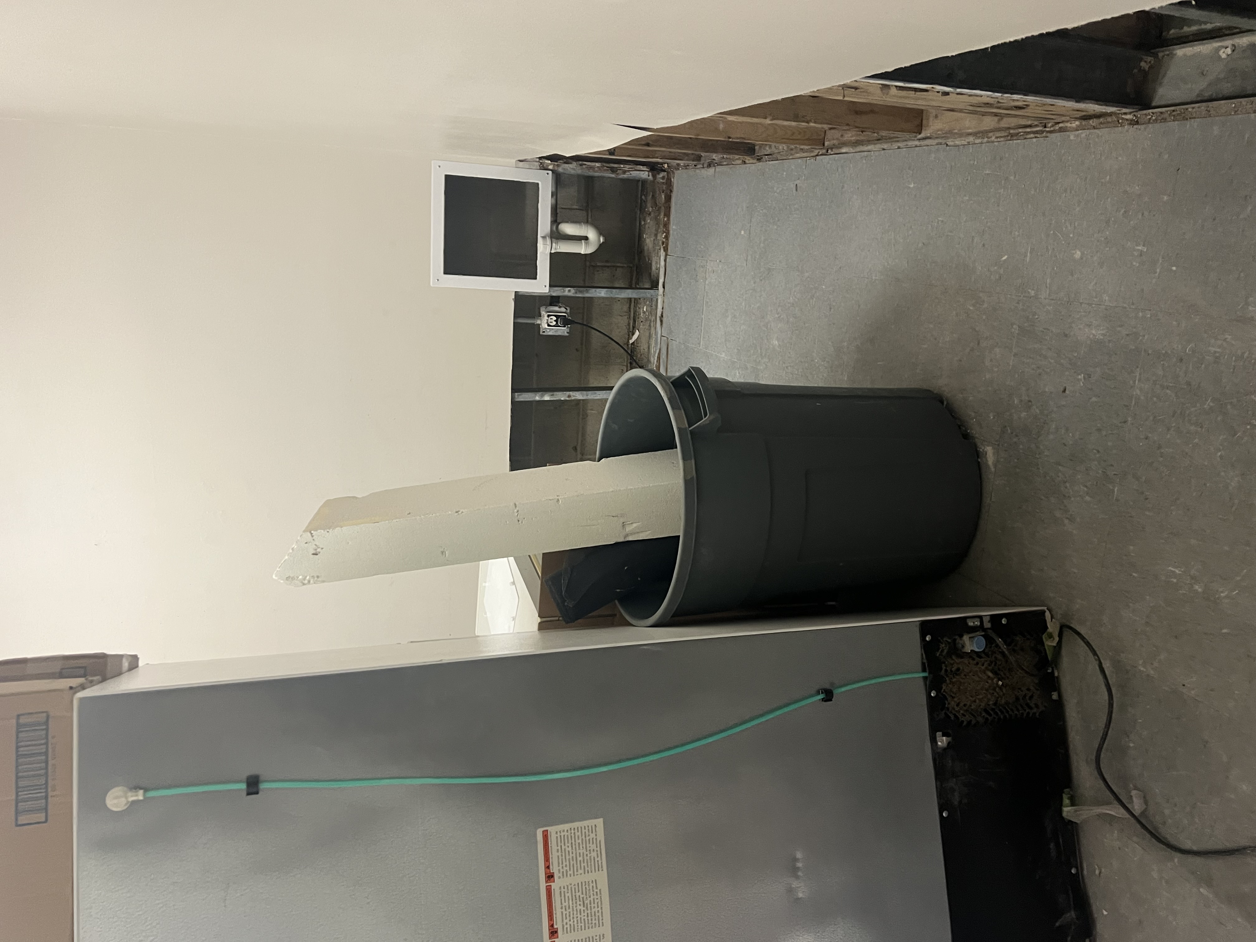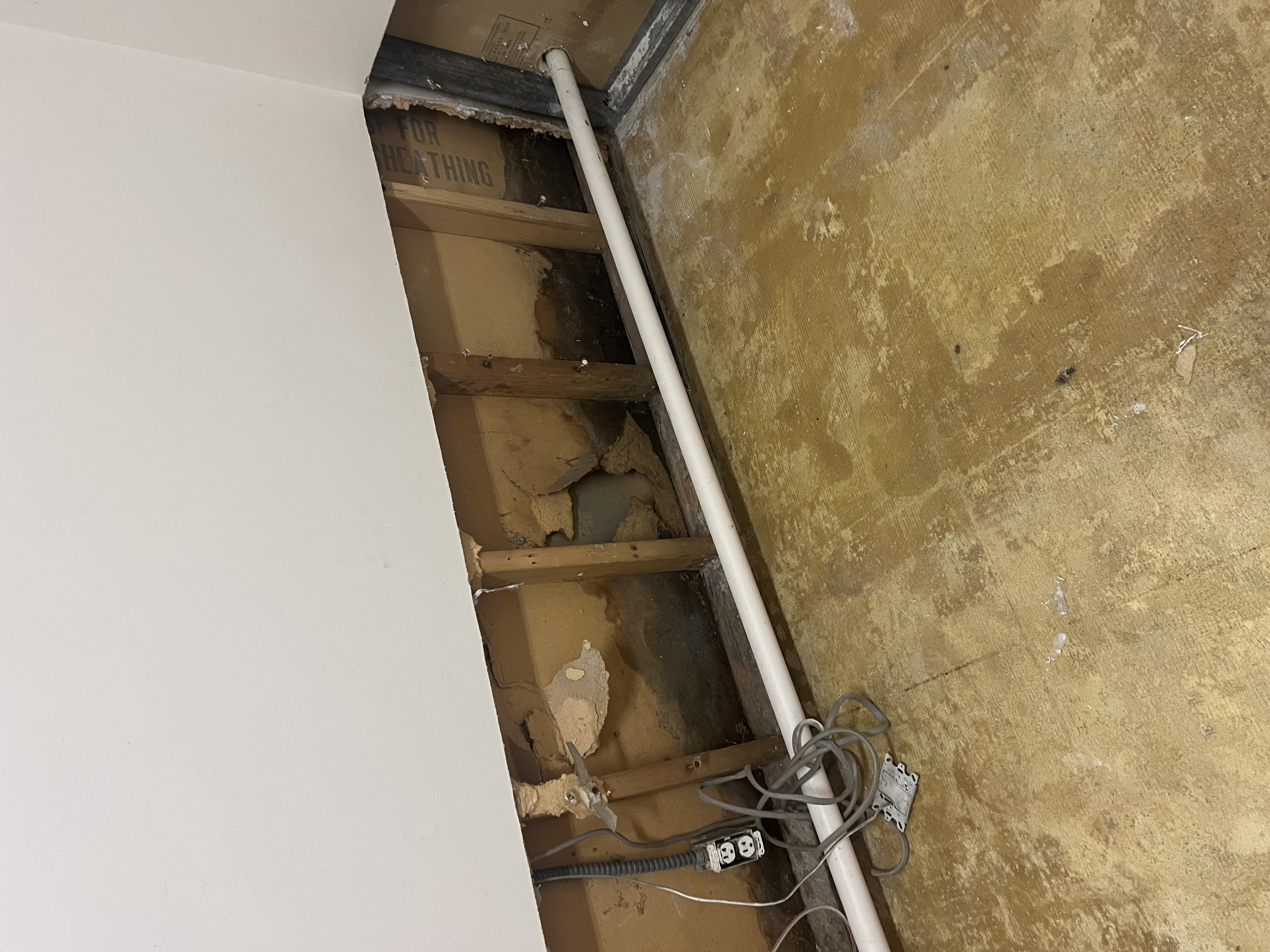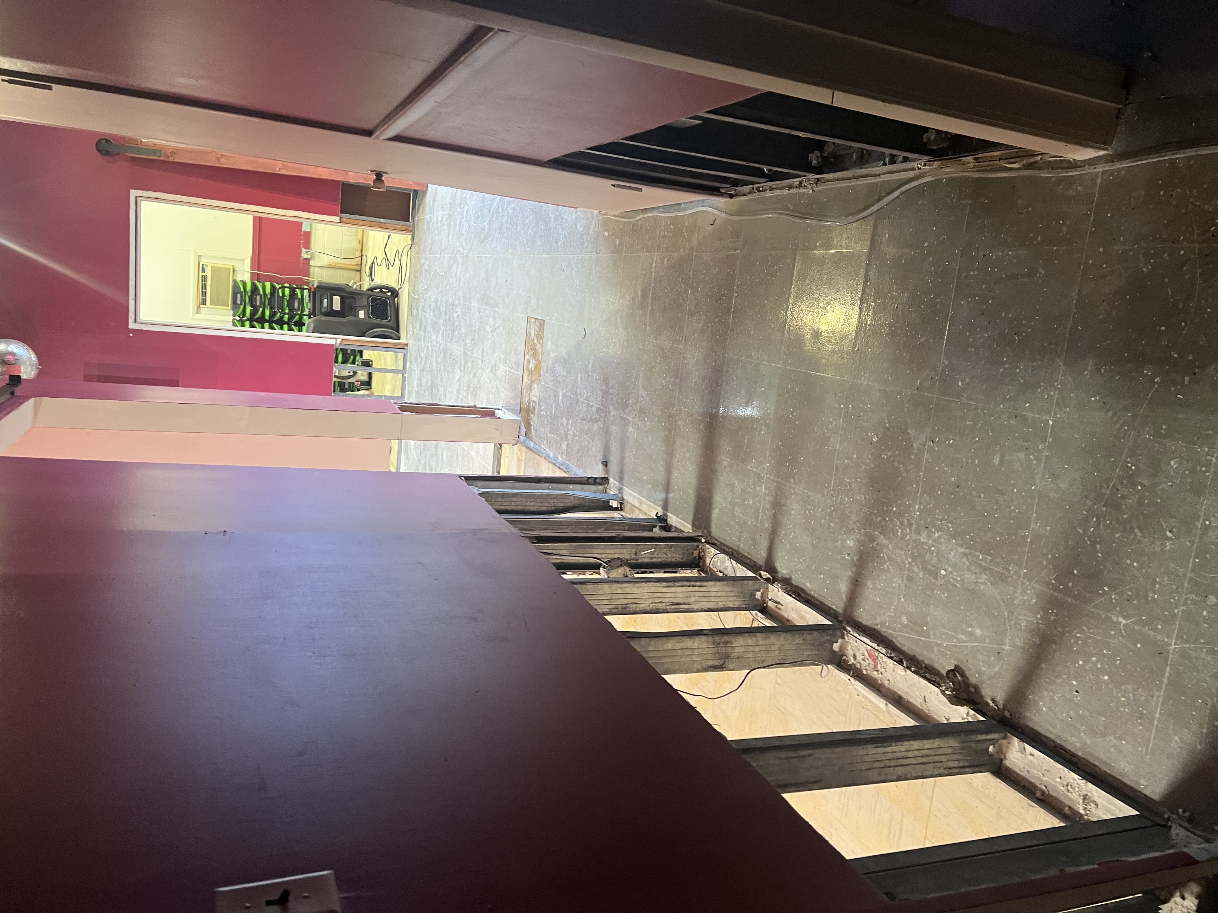 For the past week, we've been living through the first phase of the flood remediation: removing all the water-damaged flooring, drywall (fortunately they only had to take everything below about two feet), and insulation, treating the subfloor slab, wooden studs, and insides of the walls with antimicrobial products, and some really intensive ventilation and dehumidification.